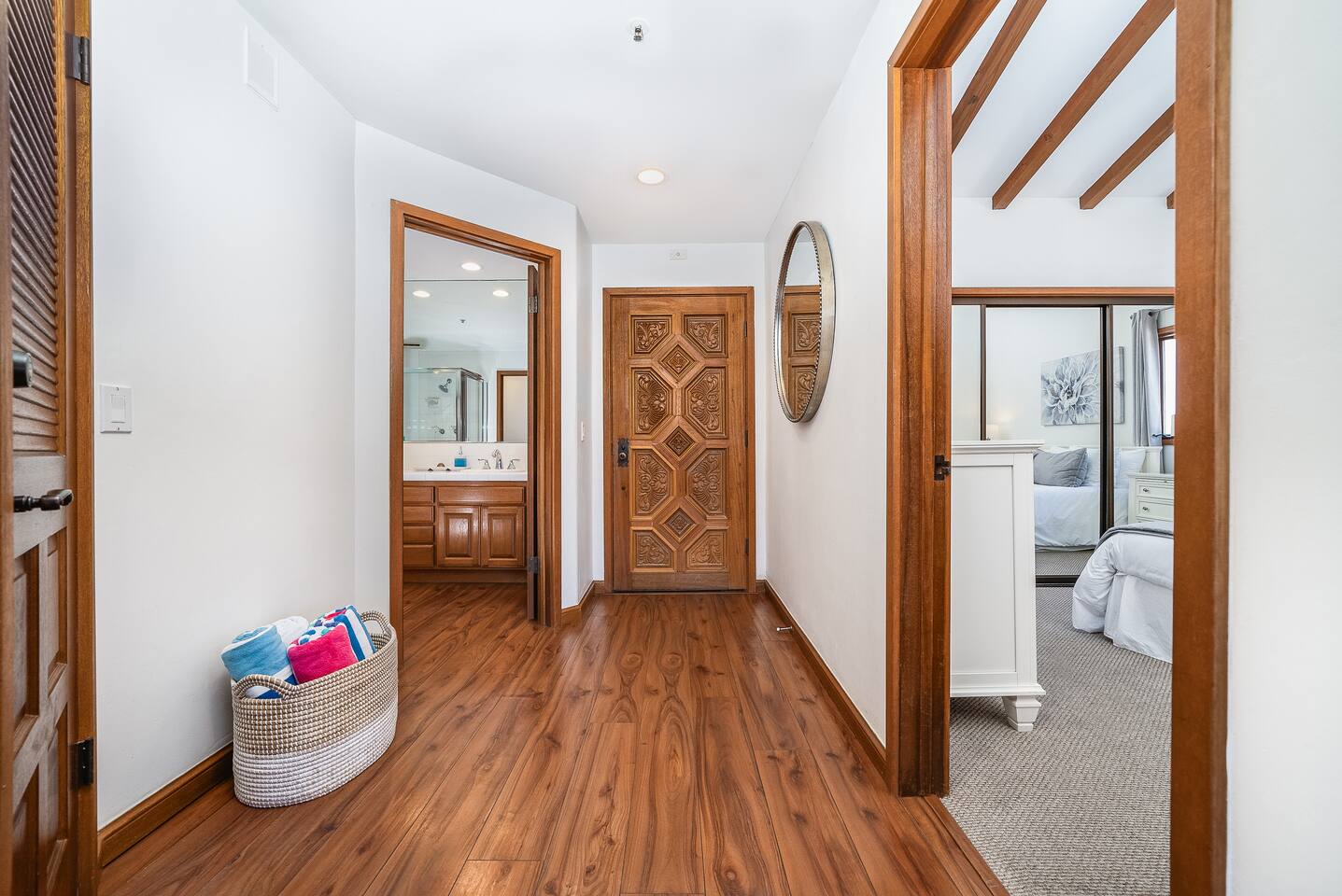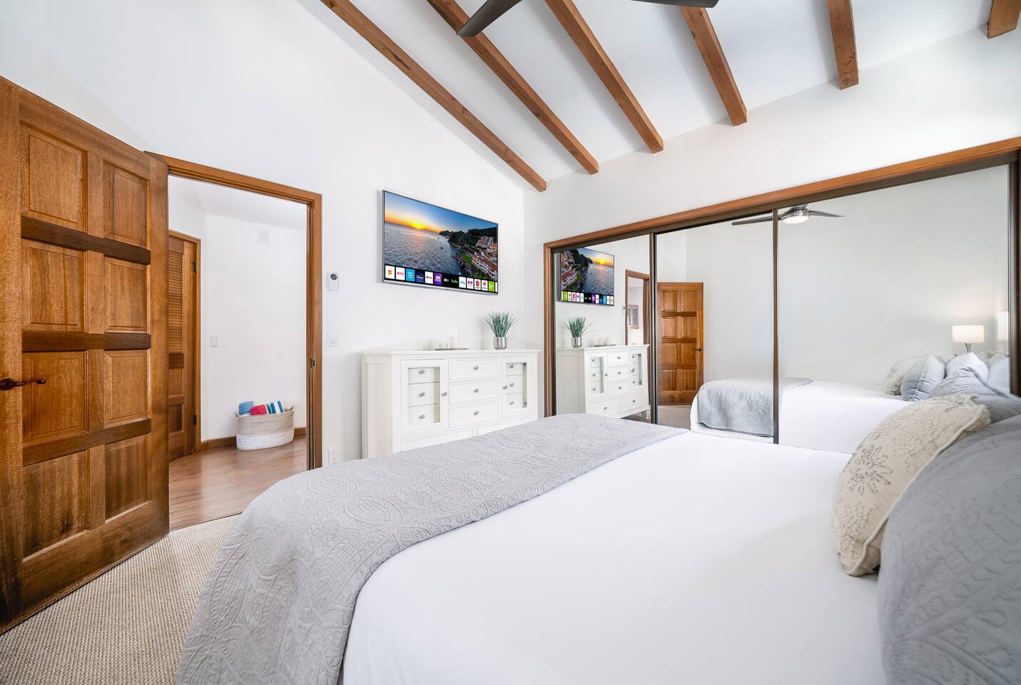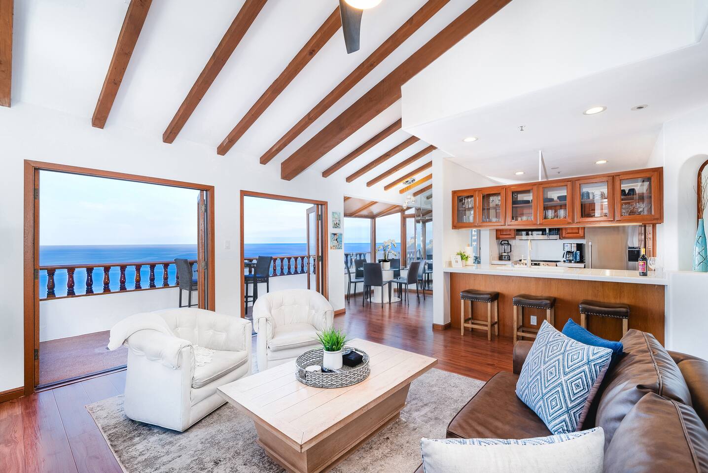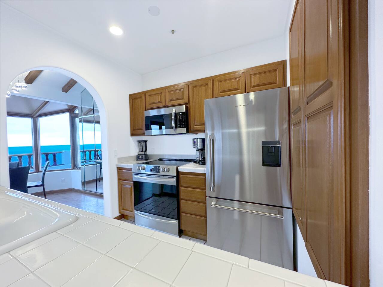 This upper condo opens to an entry hallway with spacious bathroom with shower, soaking tub and dual sinks to the right. On the left is a beautiful bedroom with vaulted, beamed ceilings, new bedroom set, California King bed, dual nightstands and large dresser. The mirrored wardrobe closet features lots of storage and there's a 2022 LG smart TV with streaming services. Directly ahead is a very spacious living room with high, vaulted ceilings which opens to the ocean with large view window, dual sets of French doors with glass, and bay windows which enclose the dining area. The kitchen features all new stainless steel appliances (Fisher & Paykel refrigerator with ice maker and water dispenser, GE Monogram smart dishwasher, and Frigidaire microwave, cooktop and oven.) The living room features a 2022 LG smart TV, lots of board games and puzzles, a pull-out leather sofa sleeper and a new 2023 inflatable air mattress. We have premium 680-thread count sheets and pillowcases and much more!