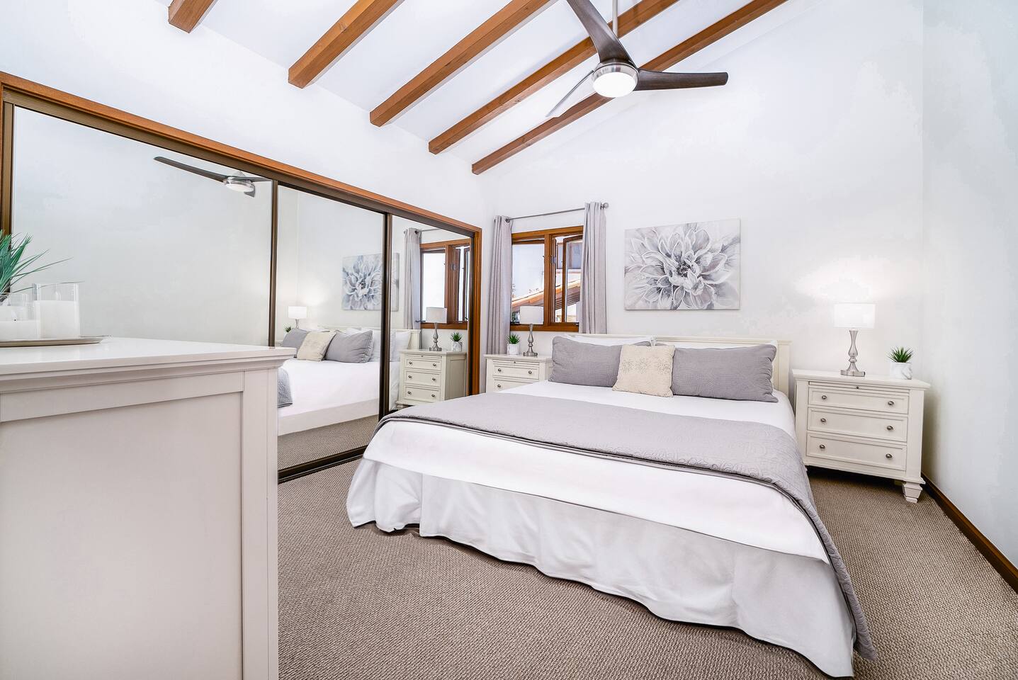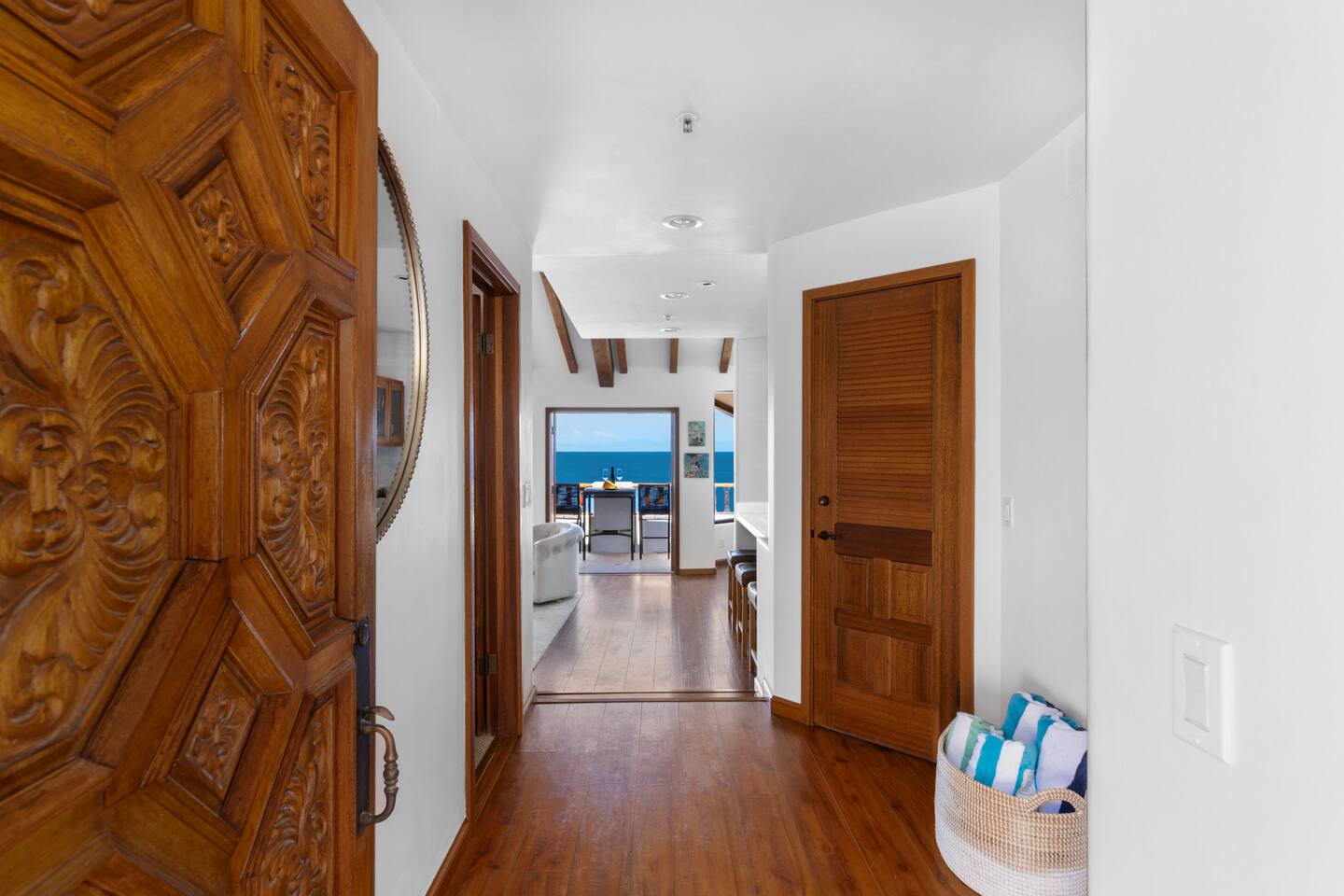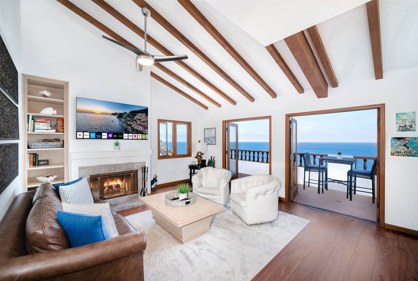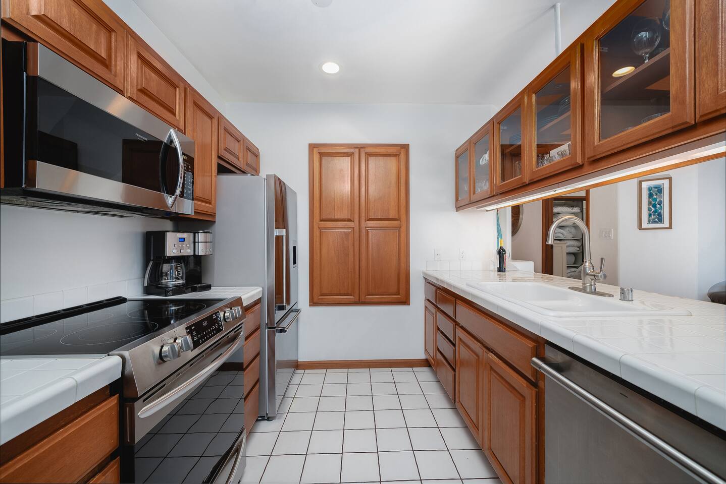This upper condo opens to an entry hallway with spacious bathroom with shower, soaking tub and dual sinks to the right. On the left is a beautiful bedroom with vaulted, beamed ceilings, new bedroom set, California King bed, dual nightstands and large dresser. The mirrored wardrobe closet features lots of storage and there's a 2022 LG smart TV with streaming services. Directly ahead is a very spacious living room with high, vaulted ceilings which opens to the ocean with large view window, dual sets of French doors with glass, and bay windows which enclose the dining area. The kitchen features all new stainless steel appliances (Fisher & Paykel refrigerator with ice maker and water dispenser, GE Monogram smart dishwasher, and Frigidaire microwave, cooktop and oven.) The living room features a 2022 LG smart TV, lots of board games and puzzles, a pull-out leather sofa sleeper and a new 2023 inflatable air mattress. We have premium 680-thread count sheets and pillowcases and much more!