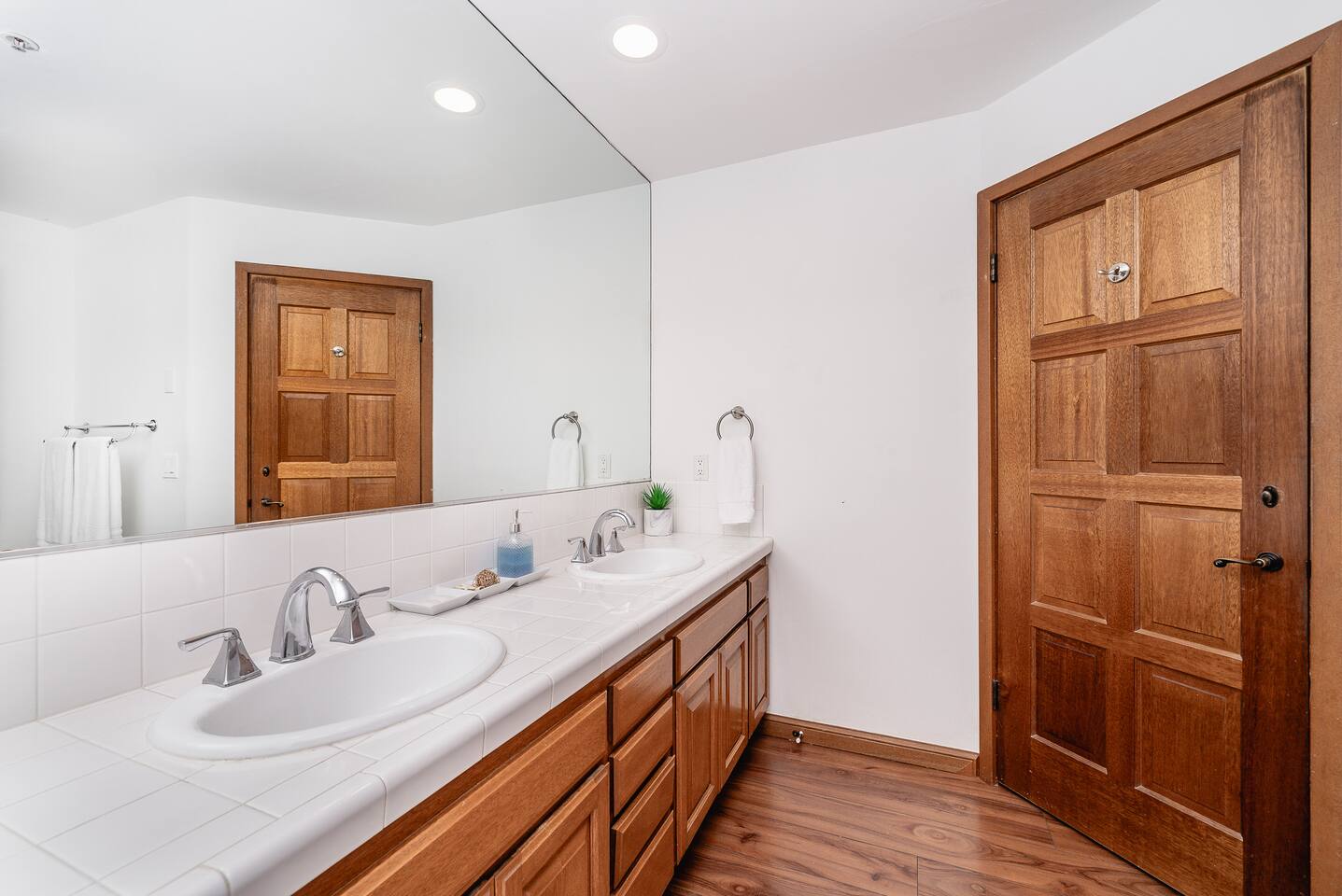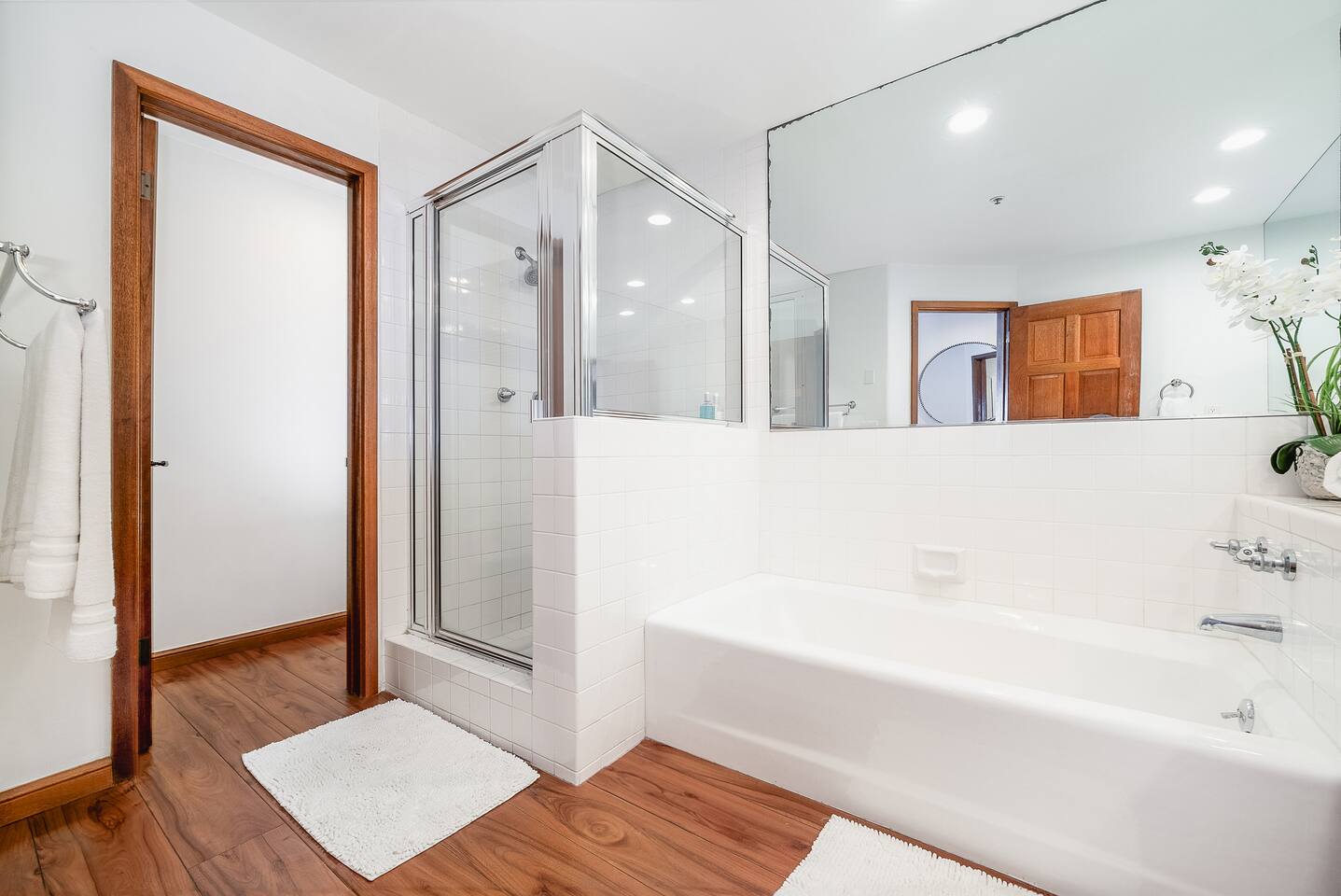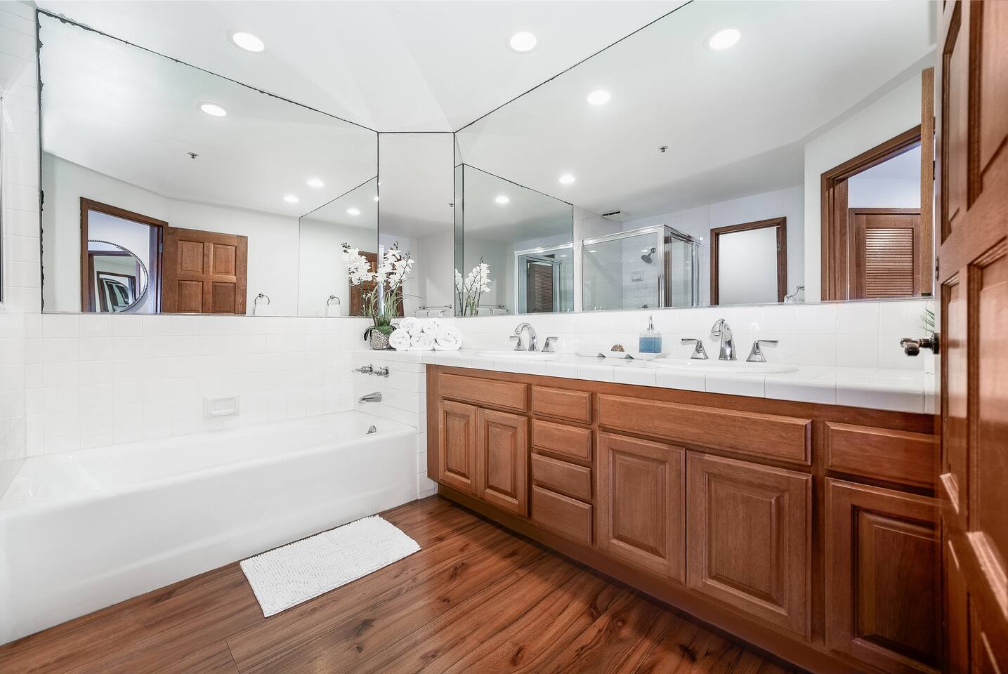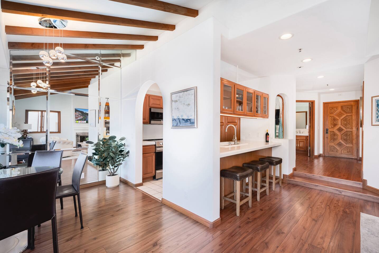 This upper condo opens to an entry hallway with spacious bathroom with shower, soaking tub and dual sinks to the right. On the left is a beautiful bedroom with vaulted, beamed ceilings, new bedroom set, California King bed, dual nightstands and large dresser. The mirrored wardrobe closet features lots of storage and there's a 2022 LG smart TV with streaming services. Directly ahead is a very spacious living room with high, vaulted ceilings which opens to the ocean with large view window, dual sets of French doors with glass, and bay windows which enclose the dining area. The kitchen features all new stainless steel appliances (Fisher & Paykel refrigerator with ice maker and water dispenser, GE Monogram smart dishwasher, and Frigidaire microwave, cooktop and oven.) The living room features a 2022 LG smart TV, lots of board games and puzzles, a pull-out leather sofa sleeper and a new 2023 inflatable air mattress. We have premium 680-thread count sheets and pillowcases and much more!
